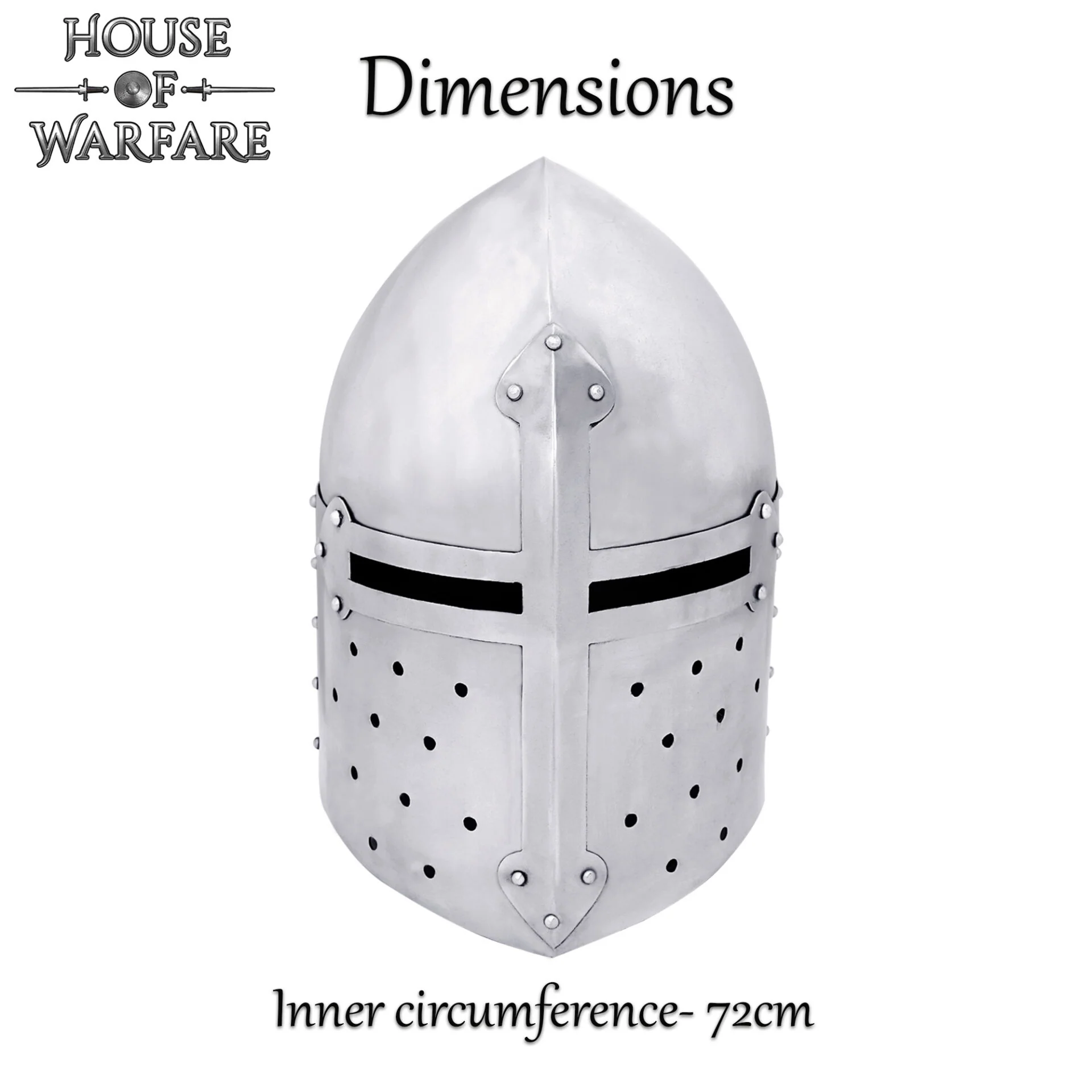 este casco se inspira en el diseño que llevaban los soldados y caballeros entre los siglos XII y XV. Con una parte superior puntiaguda y aberturas para los ojos, proporciona tanto defensa como un ajuste seguro para el usuario. El casco cuenta además con orificios de ventilación que garantizan la transpirabilidad, mientras que el