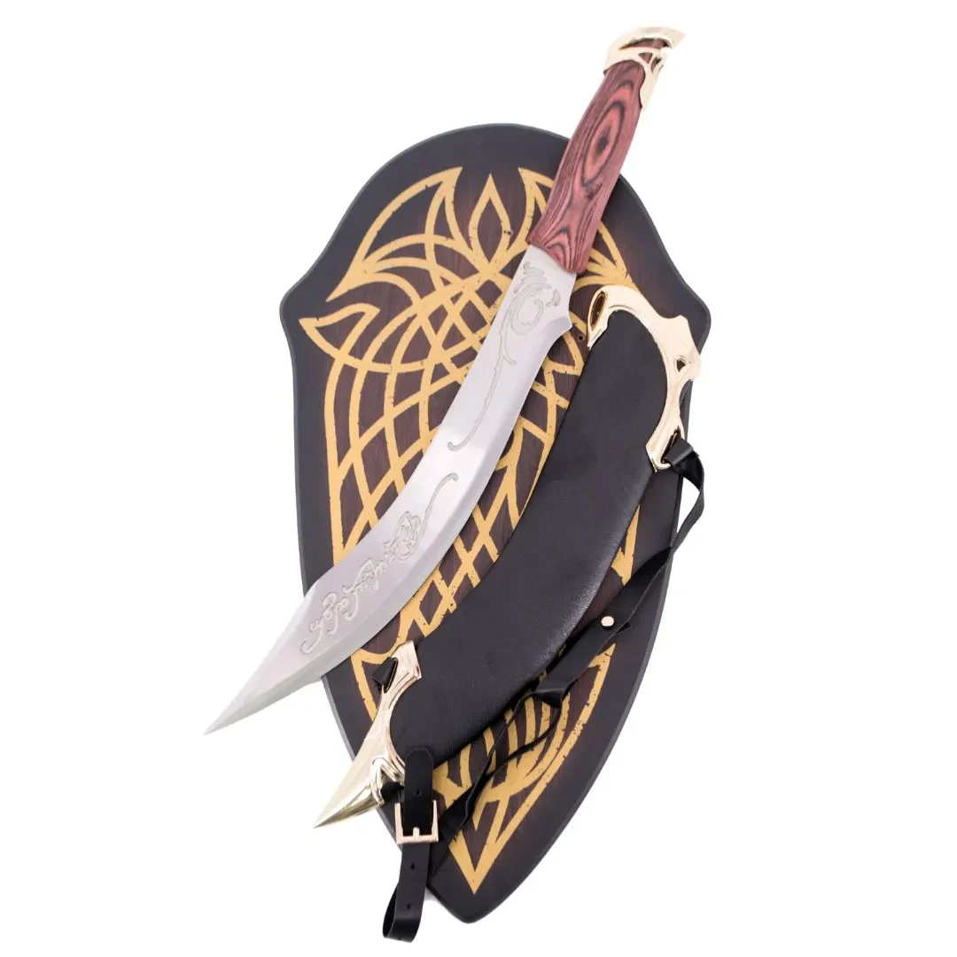 Cuchillo Élfico de Aragorn – Regalo de los elfos de Rivendel, este cuchillo de combate presenta una hoja curva de acero inoxidable con grabados élficos y una empuñadura de madera. Un complemento indispensable para cualquier aventurero.